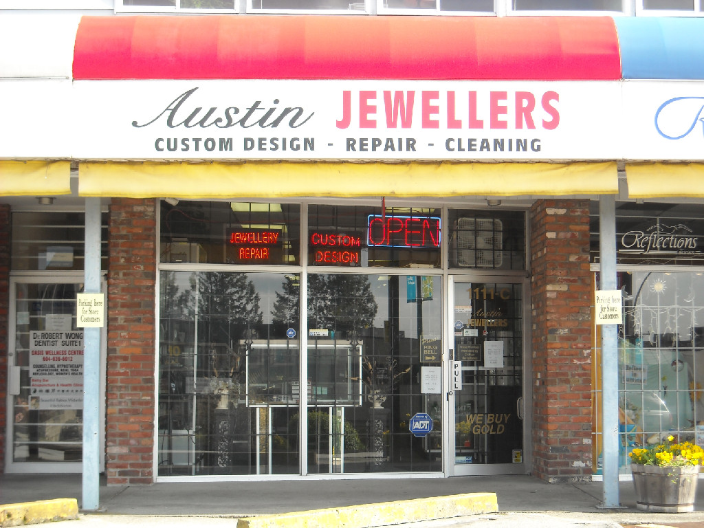 Austin Jewellers sells precious metals and stones. The shop also advertises repairs, appraisals and custom work.