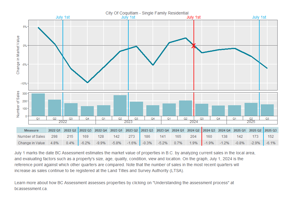 According to BC Assessment, typical assessed values for both single-family homes and strata properties declined across Coquitlam, Port Coquitlam, and Port Moody in the 2026 assessment roll, which is based on market conditions as of July 1, 2025.