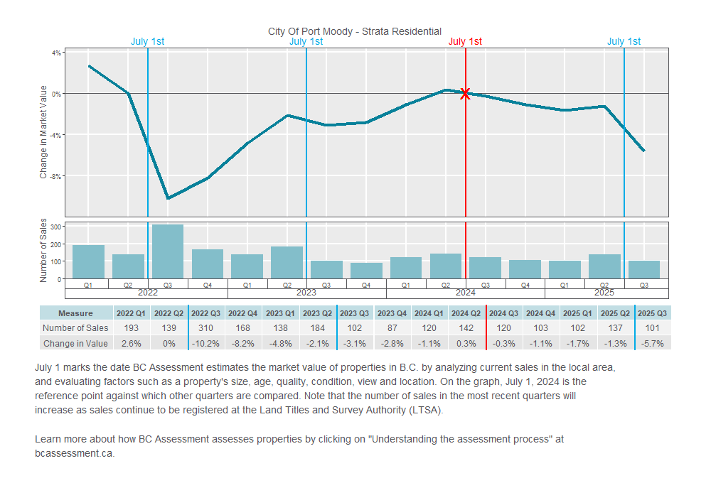 Typical strata values fell four percent in Coquitlam, five percent in Port Coquitlam, and five percent in Port Moody between the 2025 and 2026 assessment cycles.