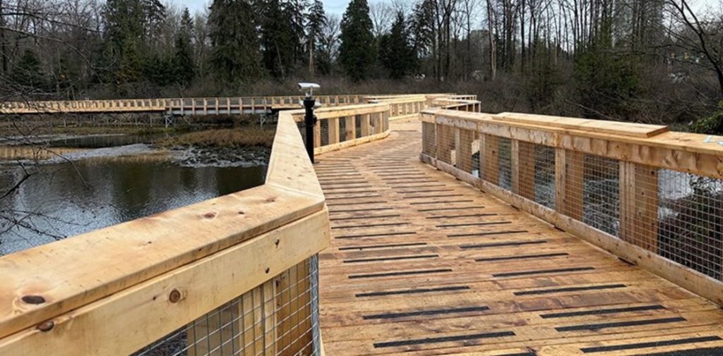 Approximately 440 metres of boardwalk, bridge and gravel is being replaced, a viewing platform is being built, where a newly crafted house post from the Katzie First Nation will stand as part of the ‘In the Presence of Ancestors’ project.