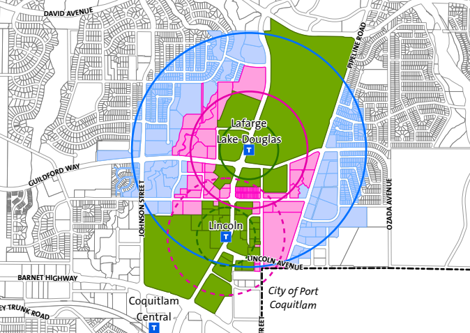 There are eight TOA circles that are either inside Coquitlam or spill over the municipal border from Port Moody, Burnaby, and New Westminster. The closer a property is to transit, the higher the density. Maximum building heights range from 20 storeys for properties within 200 metres of a SkyTrain to eight storeys for properties on the outskirts of the circle.