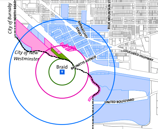 For example, a property on Gauthier Avenue might be close to Braid Station but getting there would likely be a 15-20 minute walk that crosses a highway.