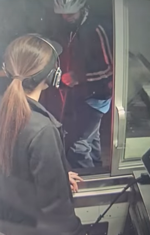 The man was between 30 and 40 years old with a dark beard, slim build, and was wearing a dark jacket with white lines down the sleeves.