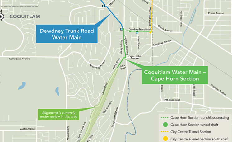 Metro Vancouver is currently at work on the 1.6-kilometre Dewdney Trunk Road water main. Placed between Lougheed Highway and Pier Drive, the 0.9-metre-diameter pipe is set to replace a 76-year-old water main.