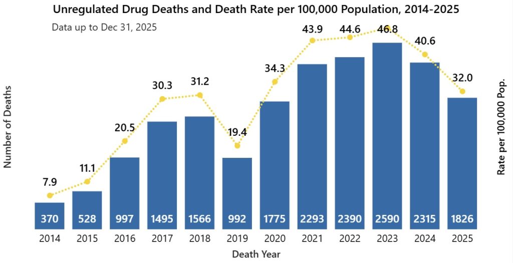 Preliminary data indicates 136 suspected unregulated drug deaths occurred in November and 141 in December 2025 – averaging roughly 4.5 deaths per day during those two months. The figures remain subject to change as investigations conclude.