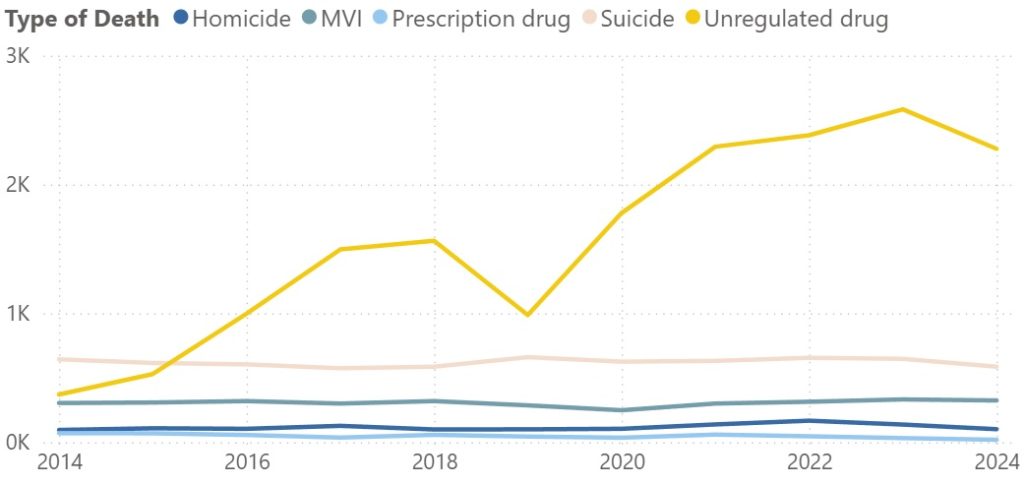 Unregulated drug-related deaths still account for the largest source of unnatural deaths in B.C. by a large margin, outpacing suicide, motor vehicle incidents, prescription drug deaths, and homicide combined.