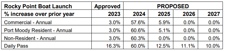 Port Moody council unanimously voted to approve a 100 percent user-pay model for the launch, which is projected to increase the price of annual passes and daily fees by 60 percent next year. For comparison, those fees only increased three percent in 2023.