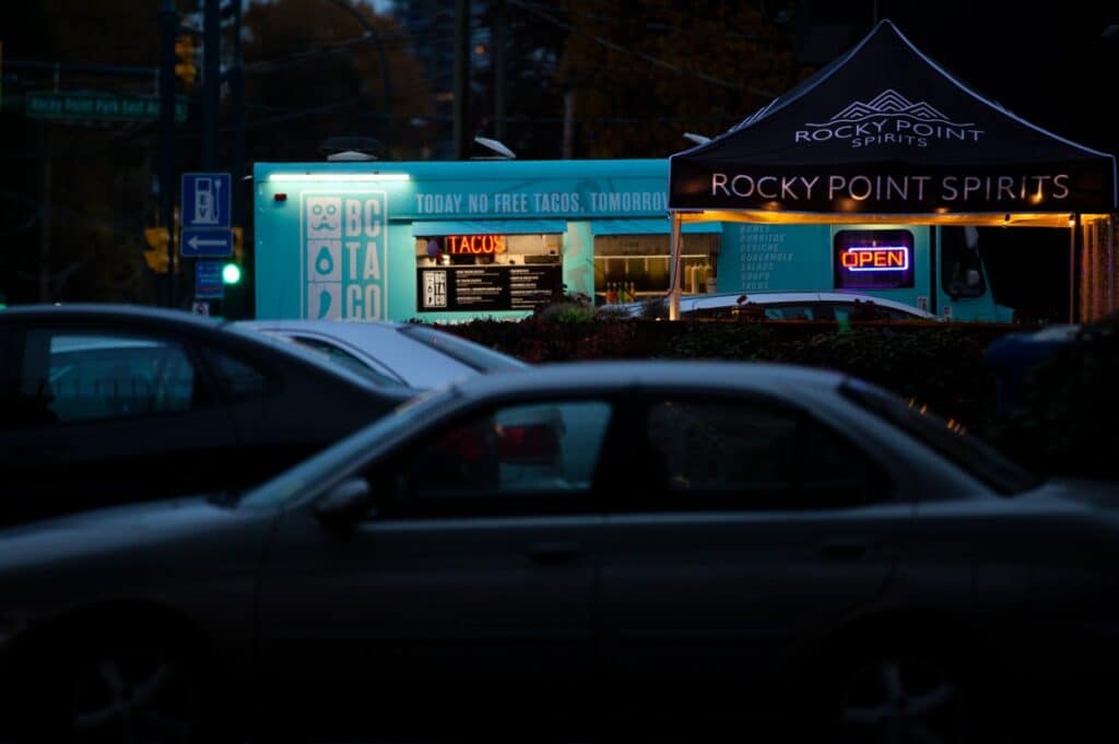 For the most successful trucks, brand factors in. The trucks aren’t driving blank white vans. Nonna’s Cucina is a sleek black silhouette, a white drawing of a Nonna on the side. BC TACO, regularly found at Rocky Point Spirits on Murray is a seafoam green while Wings is the colour of a classic barn.