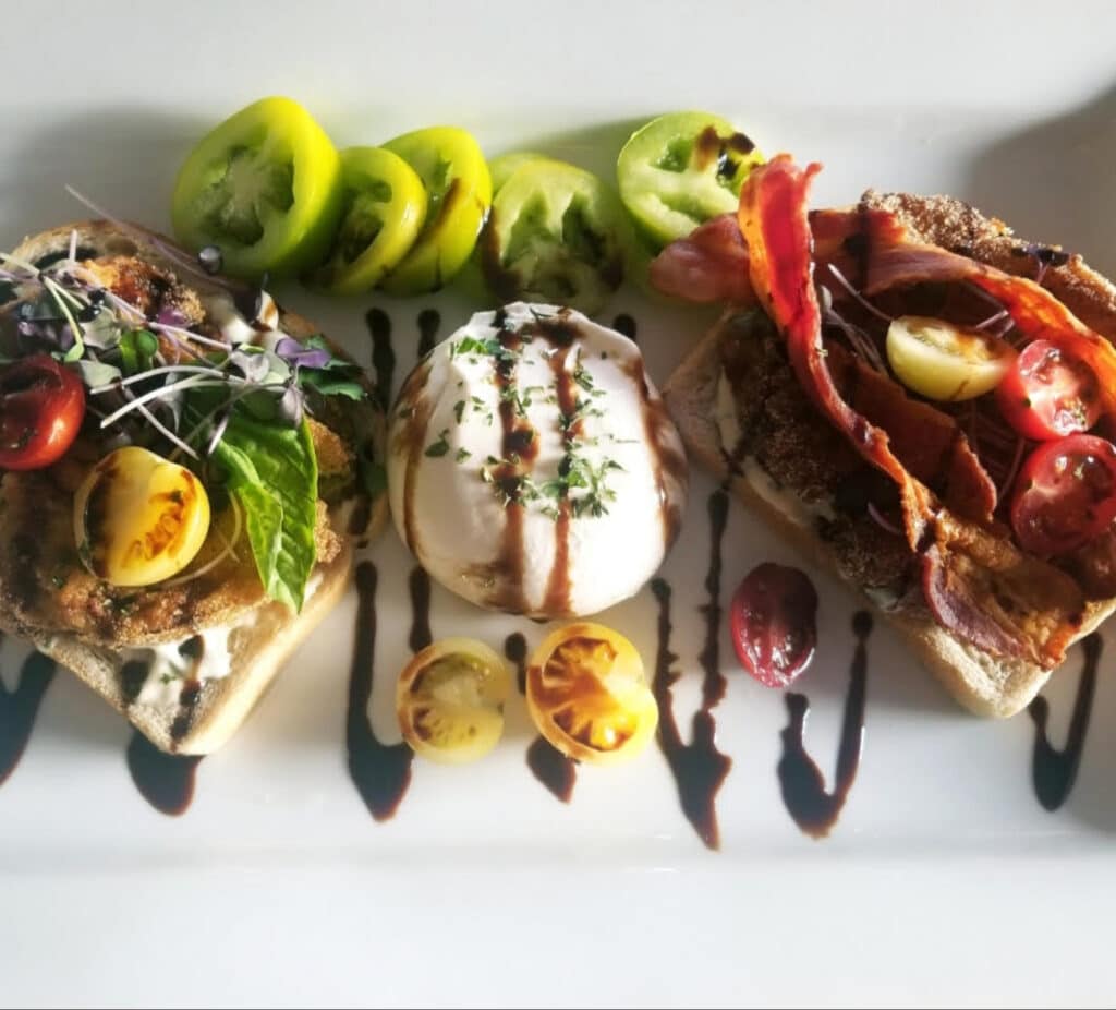 For a Fried Green Tomato Caprese Sandwich, smear toasted bread with burrata, top with hot fried green tomato, basil and finish with microgreens and reduced balsamic.