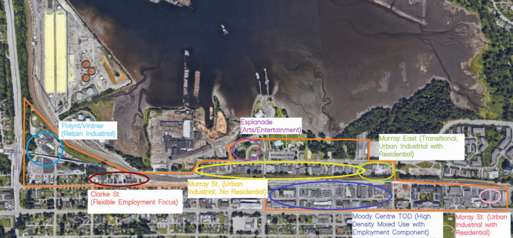 The strategy proposes zoning flexibility for numerous corridors around the city, including Clarke Street, Murray Street, Moray Street, and the Moody Centre Transit Oriented Development (TOD) area.