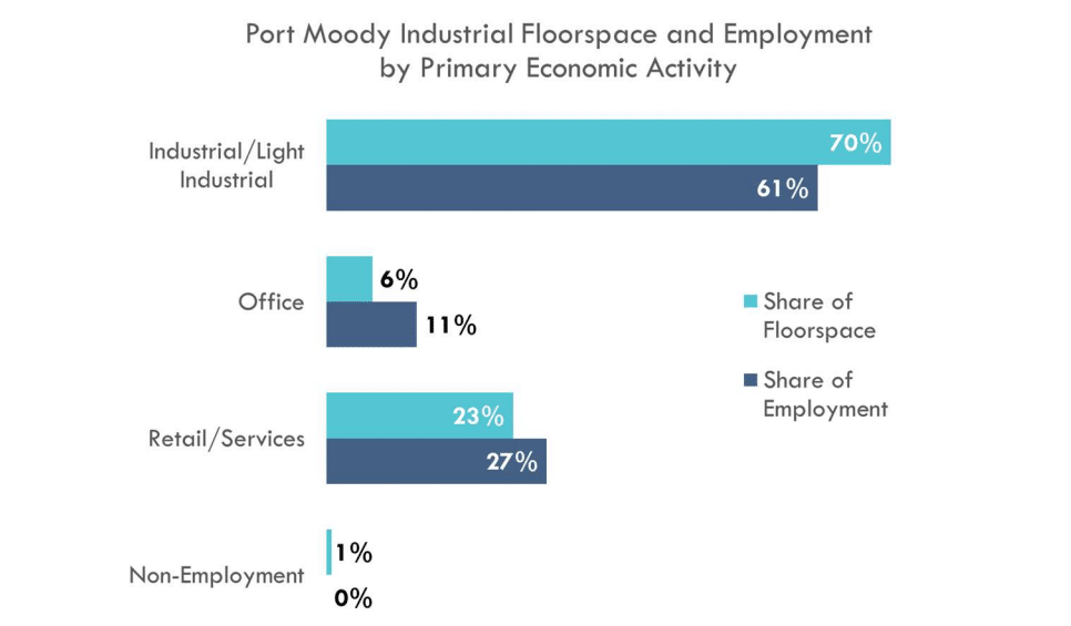 Currently Port Moody has 1.355 million square feet of floor space on industrial zoned parcels – excluding the city’s north shore and obsolete buildings – hosting an estimated 1,400 jobs.