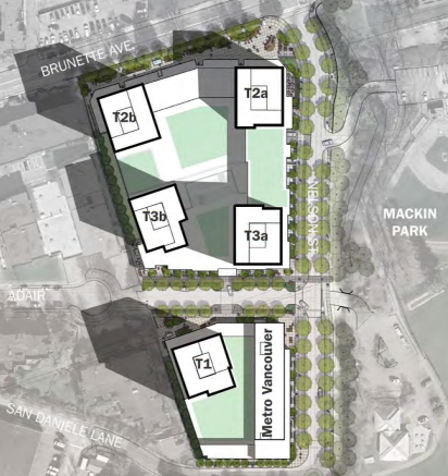 With a total of 1,412 units, the Century Group development would stretch from just below Brunette Avenue toward Lougheed Highway. The project would replace a three-storey building built in 1979 and owned by Metro Vancouver’s housing division, allowing Metro Vancouver to swap the 30 non-market units with 100 new affordable units.