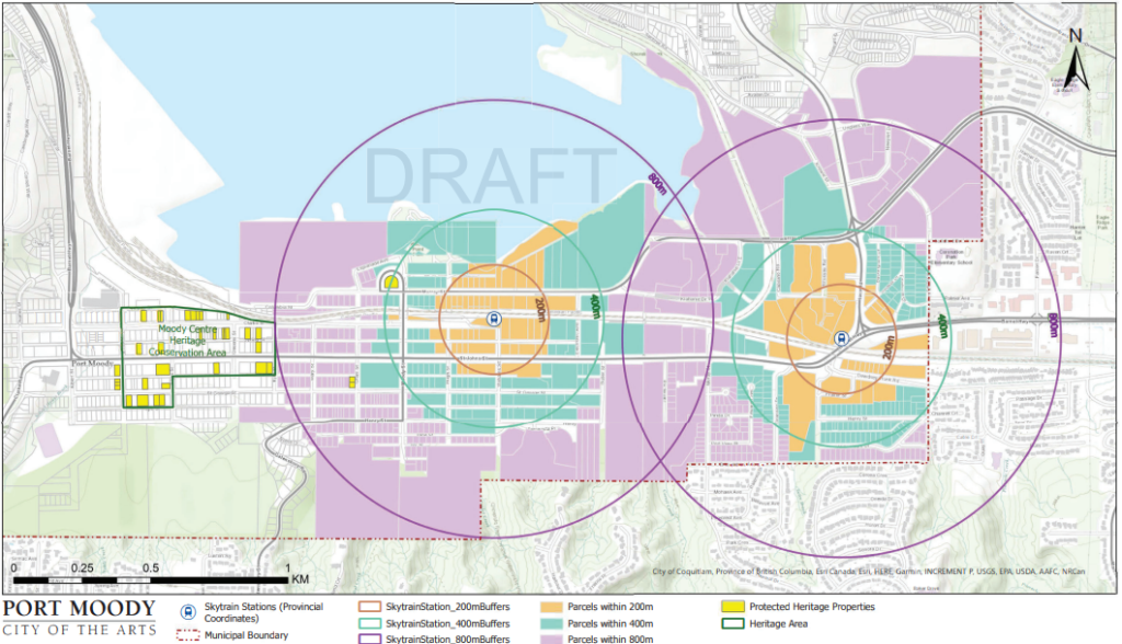 Both Moody Centre and Inlet Centre stations will have minimum allowable heights and density requirements placed on them, sprawling out in 200 metre, 400 metre, and 800 metre radiuses.