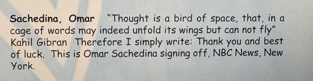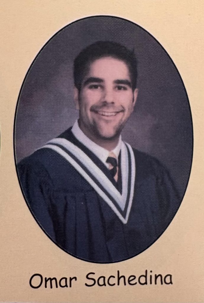 In the Port Moody Secondary School (PMSS) annual for the 1999-2000 school year, on a page dedicated to the class of 2000’s parting words, Sachedina’s are a quote from the Lebanese-American poet and artist Kahlil Gibran followed by a few of his own: “This is Omar Sachedina signing off, NBC News, New York.”