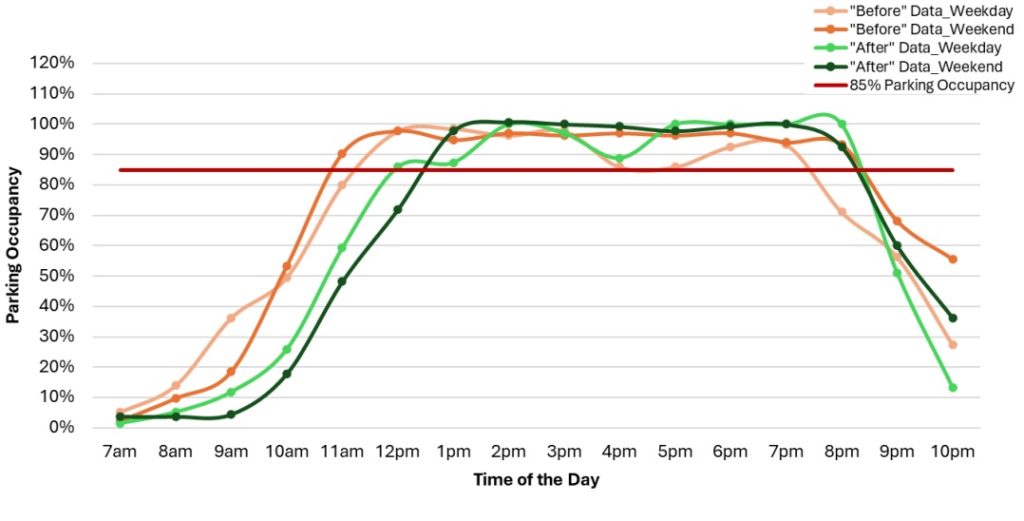 Turnover, a key measure of how many different vehicles use a space each day, has fallen sharply from pre-payment levels. Rocky Point’s main lot saw weekday turnover drop from 5.7 vehicles per stall to 4.0, and weekend turnover fall from 5.8 to 4.5. Average stays shortened slightly.