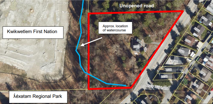 The 2.8-acre property is currently occupied by a single-family home surrounded by mature trees. An unnamed stream runs along the south and west boundary of the lot near ƛ̓ éxətəm (tla-hut-um) Regional Park, formerly known as Colony Farm Regional Park.