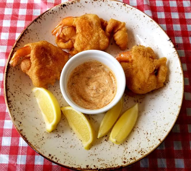 IMPORTANT NOTE: To make BIG prawn fritters like the ones in the picture, dip prawn into batter holding the tail as before, but stick a spoon underneath prawn, and gather up a spoonful of batter together with the prawn and gently “pour” the prawn and the extra batter from the spoon into the hot oil, twirling the spoon around the prawn so the extra batter covers all sides.