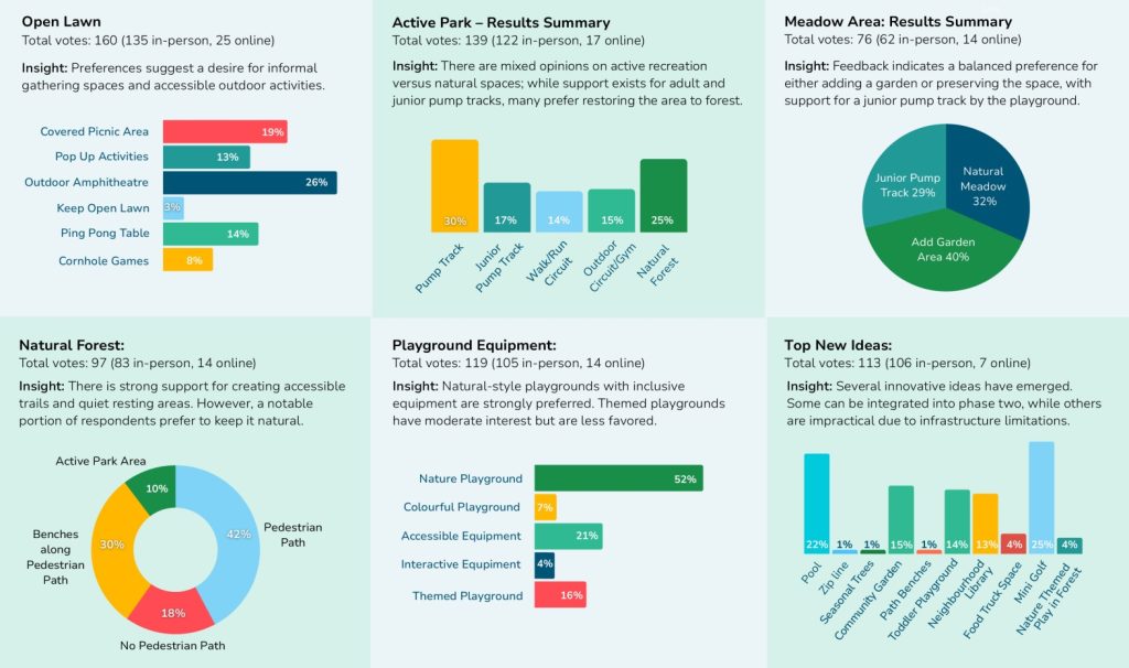 • Active Park: a bike pump track was popular, though some suggested restoring the area to forest.