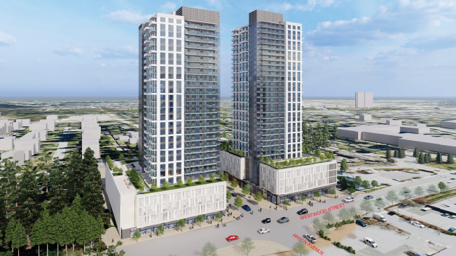 The north tower is set to be 28 storeys, or approximately 288 feet, with 264 apartments and 7,158 square feet of commercial space fronting Westwood. FAR is set at 6.1.